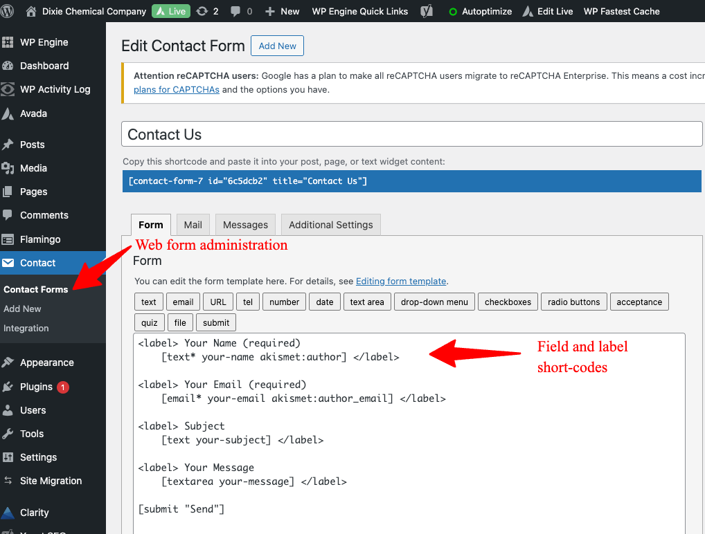 Section titled “Brief Overview of Contact Form 7 and Flamingo”This guide provides a basic overview of the Contact Form 7 and Flamingo plugins used on the Dixie Chemical websites. Note that creating or modifying forms will be covered in a follow-up training session.