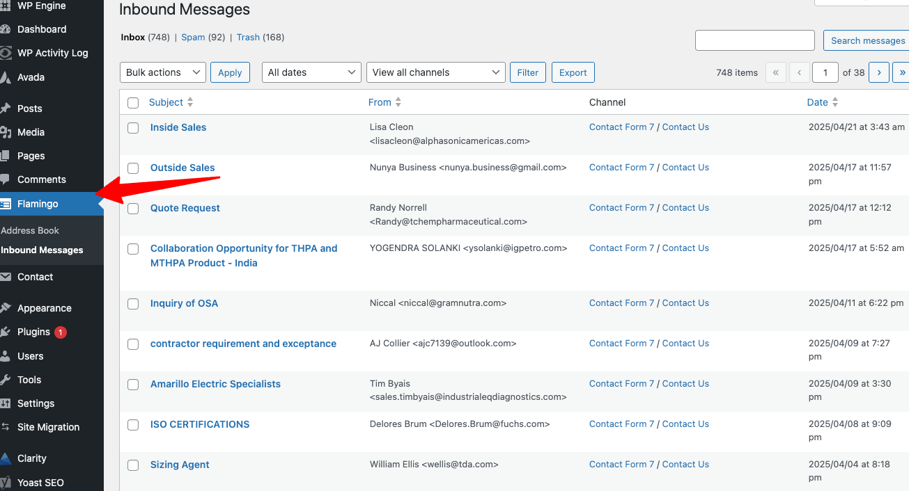Section titled “What is Flamingo?”Flamingo is a companion plugin to Contact Form 7 that captures and stores form submissions in the WordPress database. This allows you to view submission history directly in the WordPress admin area.